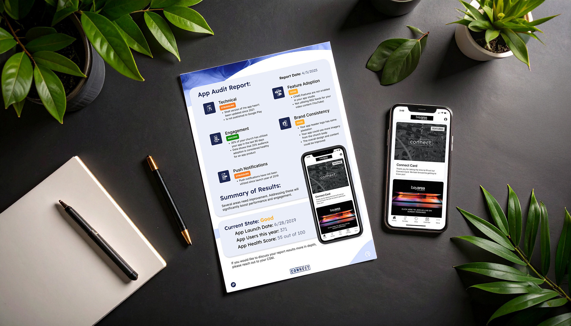 The App Audit Report acts as a “checkup” for apps — assessing everything from design and versioning to engagement metrics. Each report includes: