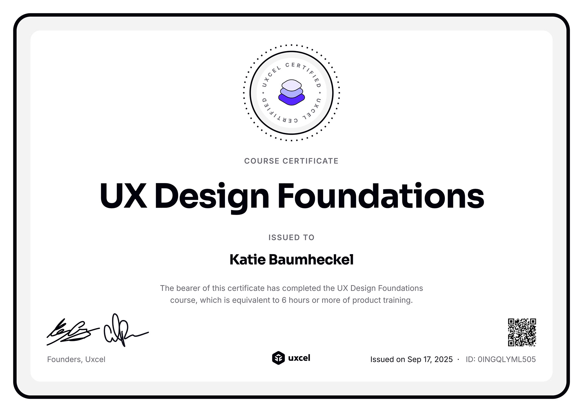I’m excited to share that I’ve completed the "UX Design Foundations" certification through Uxcel.